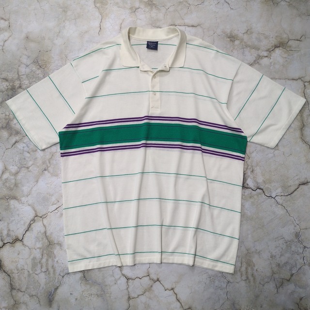 80年代から90年代ごろのPRIVATE CLUBのニットポロ。 丈短め身幅広めのボックスシルエット。 ベージュ系ボディにうっすらボーダーデザインで1着でもサマになるアイテムです。 よく見ると袖と襟がパイピングデザインになっているのも個人的にグッときました。 フロント左腹部辺りにほつれがありますがほとんど目立たず全体的にはコンディション良好です。 Size :2X 前丈 70cm 後丈 73.5cm 身幅 67cm 肩幅 54.5cm 袖丈 20.5cm color :Beige系 Material :コットン60% ポリエステル40% Condition :A S. 新品または未使用(デッドストック) A. 目立つ汚れやダメージなど無し B. 着用に支障はないが多少のダメージなどあり C. ダメージあり